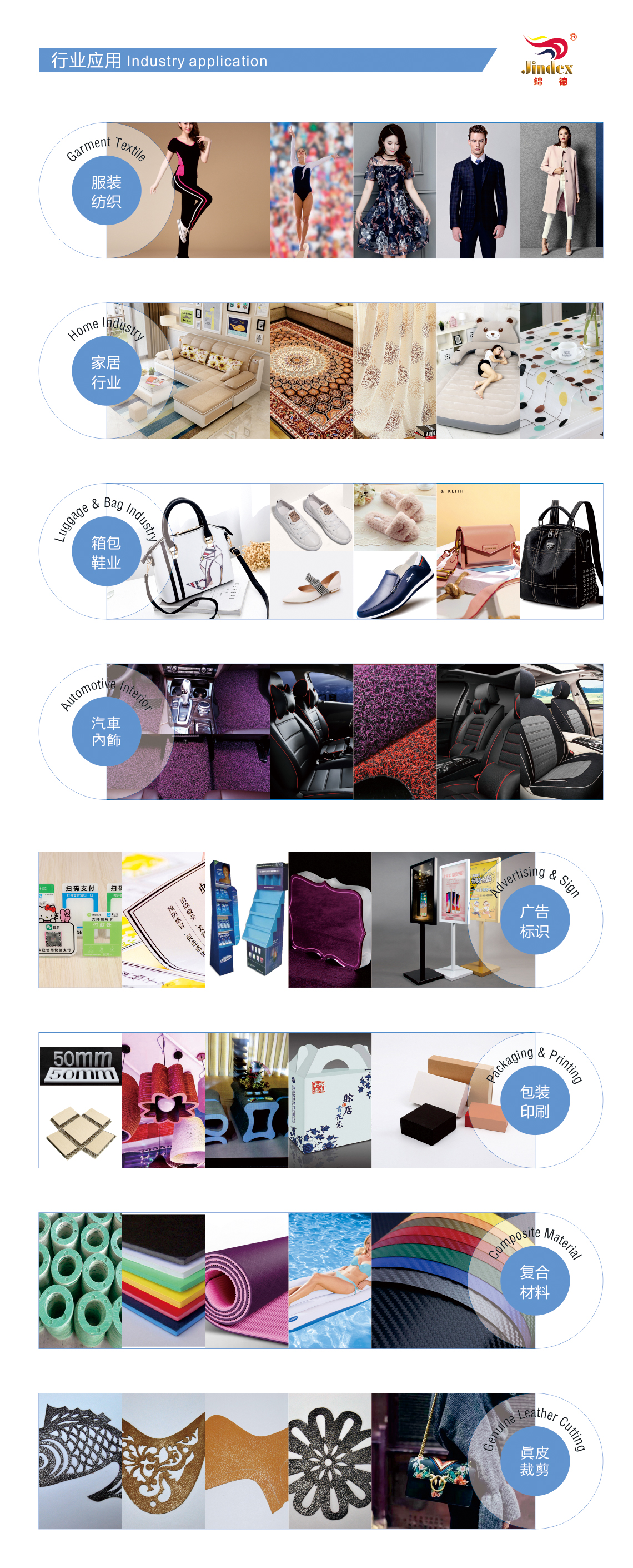 - All kinds of apparel fabrics, car seat, furniture sofa, shoe bags and other industries widely print marking, cutting and circular feed CCD after correction for the integration of intelligent high-end jet cutting robot, usually with two roll of paper, one for paper, one for material.