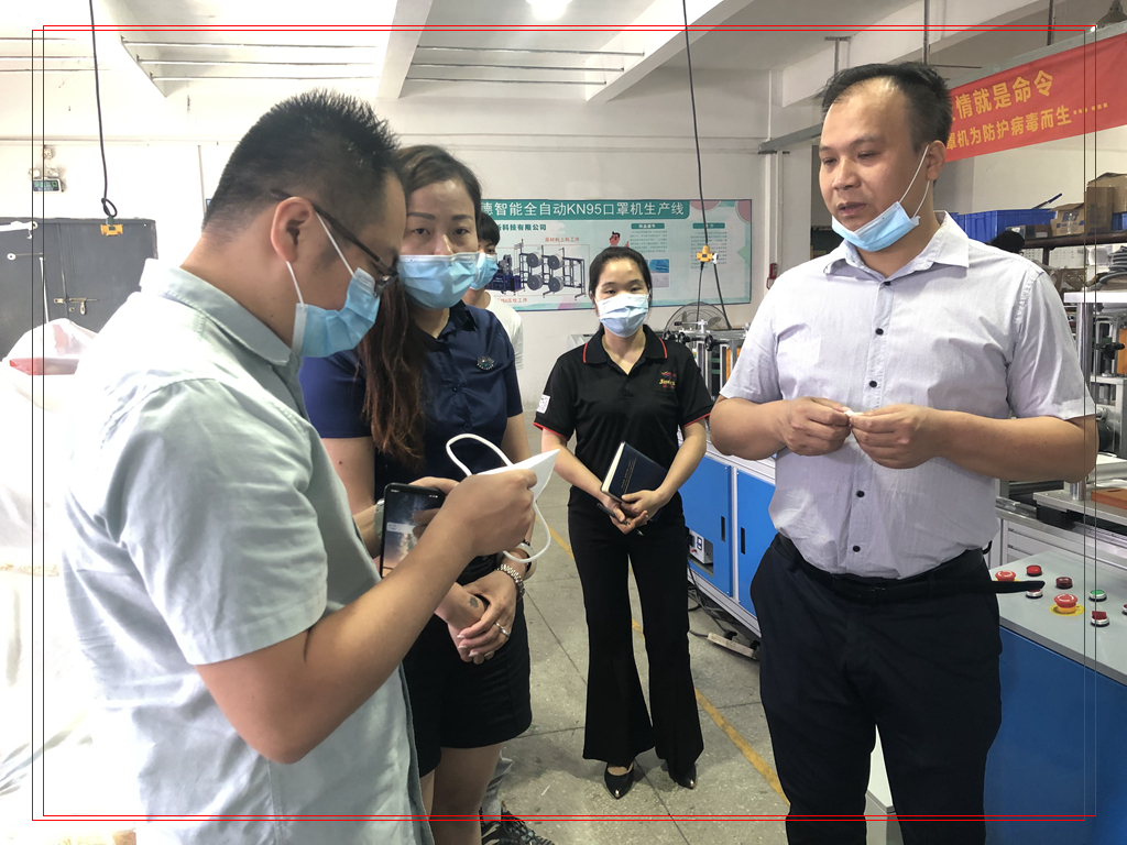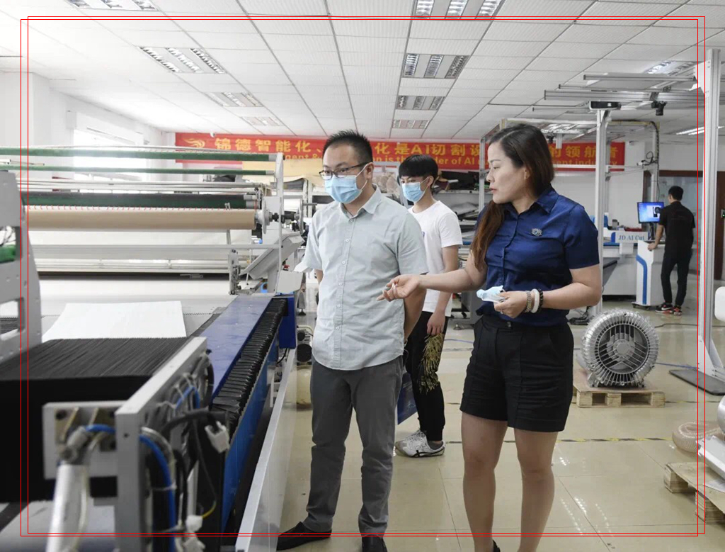 總經(jīng)理劉明軍先生為工作組介紹錦德防疫用品智能排版切割設(shè)備